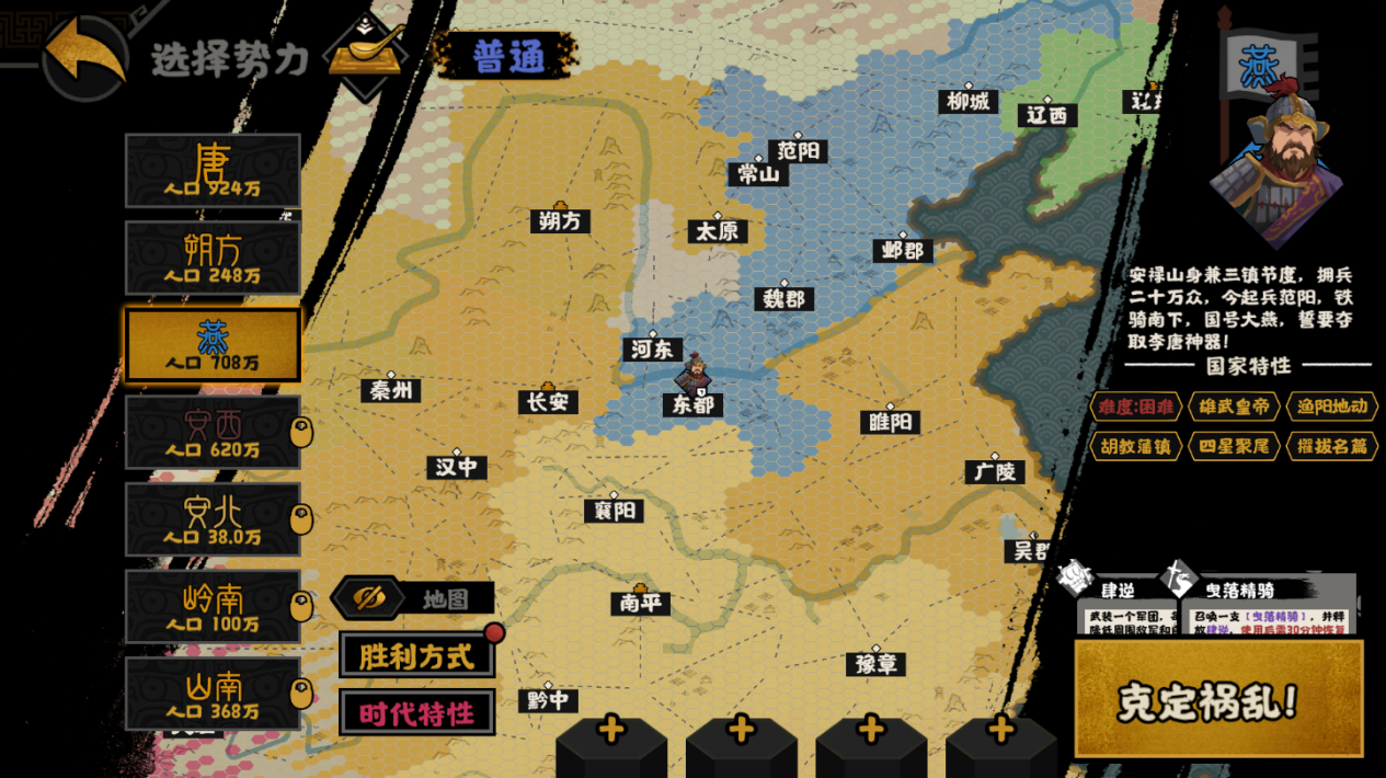 其次是以枭雄安禄山的身份开局,手握大唐最精锐的边军,目标直指两京,誓要取而代之。河北根据地并不稳固,王上要如何平衡前线猛攻与后方维稳?可否一连串胜利碾压唐廷抵抗,以防陷入拉锯战?