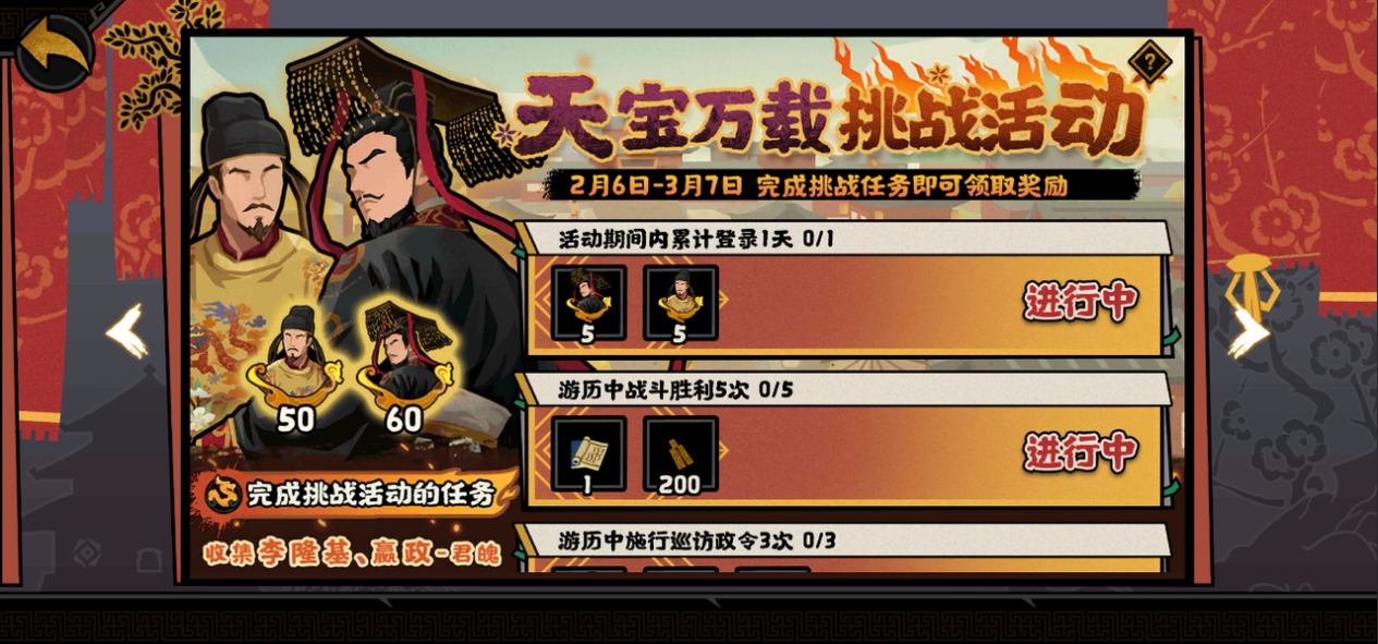 每一次重大征程的开启,我们都准备了丰厚的助力。2月6日剧本上线的同时,全新登录礼也将一同上线!天材名臣自选箱(霍去病、王羲之、荀彧)、龙须笔*3、龙瓦*10等待王上前来领取,还有春节签到、剧本挑战、好友邀请等丰富活动与福利~