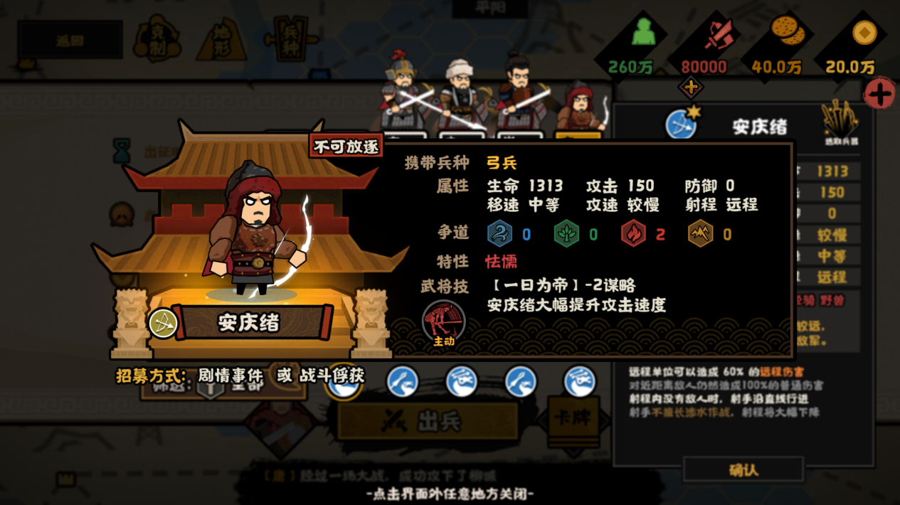 3、【渔阳地动】:出征胜利时,夺取败方5%钱粮,但威望降低5;进攻胜利后攻占进度+5,安禄山首次进入对方半场时施放【地动】