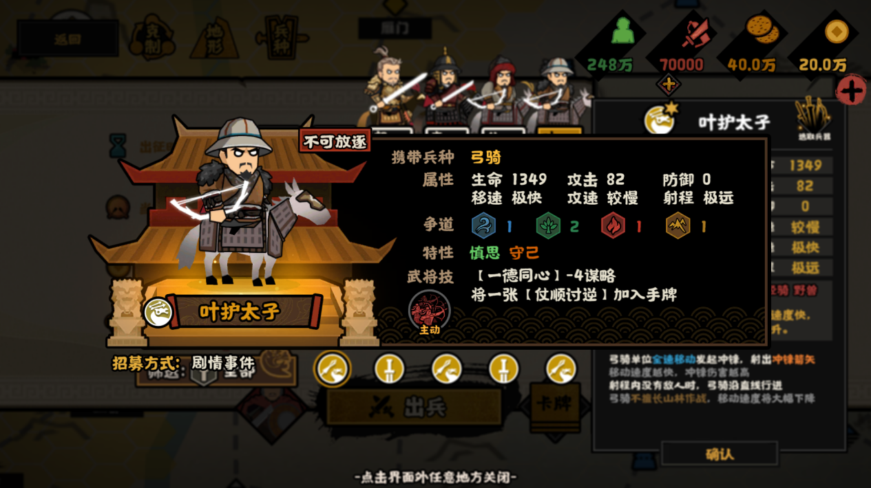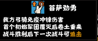 菩萨劲勇:我方弓骑免疫冲锋伤害,首个初始军团覆灭后卷土重来,战斗胜利后下一次战斗可追击