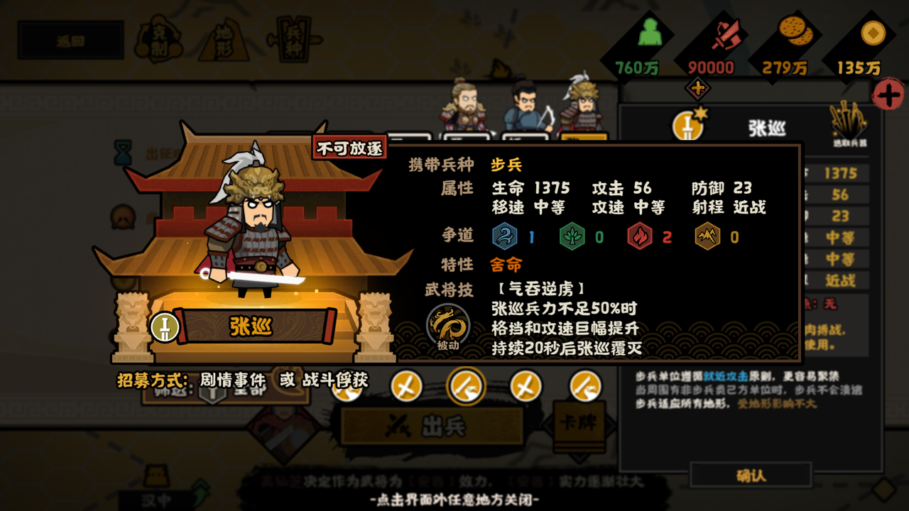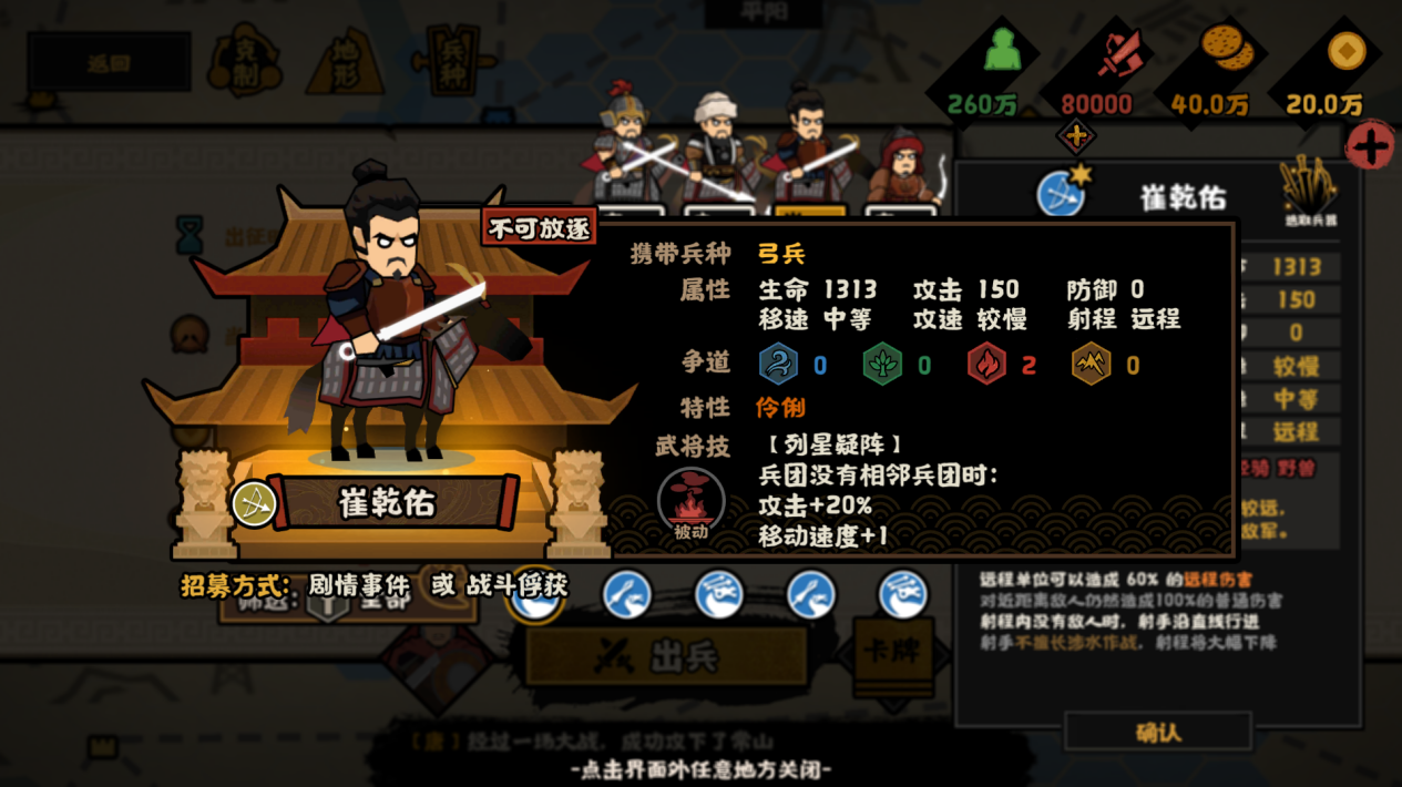 4、【鲜克有终】:民心达到60时,可用卡牌破阵。若民心不足30,每年结束时损失15%钱粮;