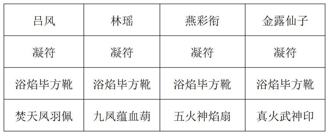 第二回合:纳兰沁月打出百战心法,燕彩衔打出焚元蓄威术、战意诀和焚元蓄力诀,金露仙子打出焚元蓄力诀和焚灵诀,燕彩衔打出五火神焰,吕风复制五火神焰并全部打出,纳兰沁月打出诛仙战意诀和诛仙业火诀。