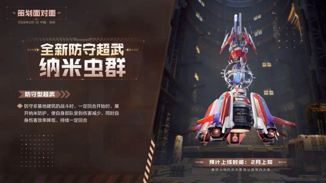 全新防守型超武预计将在2月上旬上线,新超武在防守时可获得一定的增益,减少伤害。