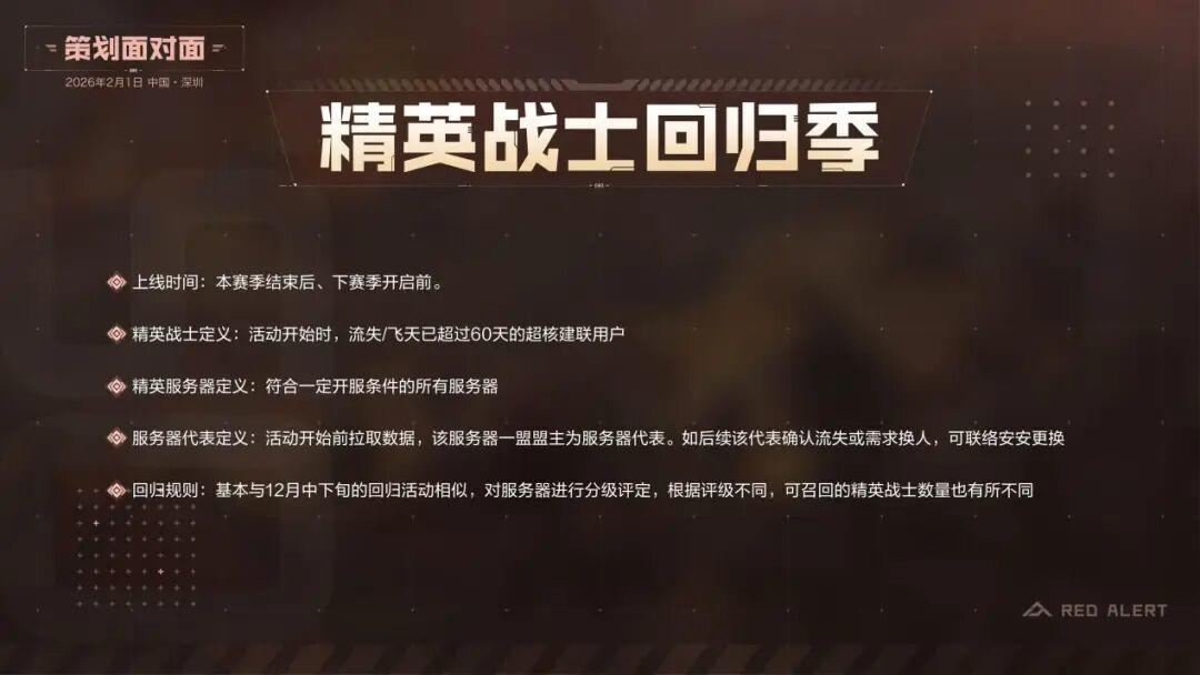 在本赛季完成后,下赛季开启前,将开启定向迁服,为超核流失用户开放通道,引导老战友回归。超核流失用户定义:流失超过60天的超核建联用户。