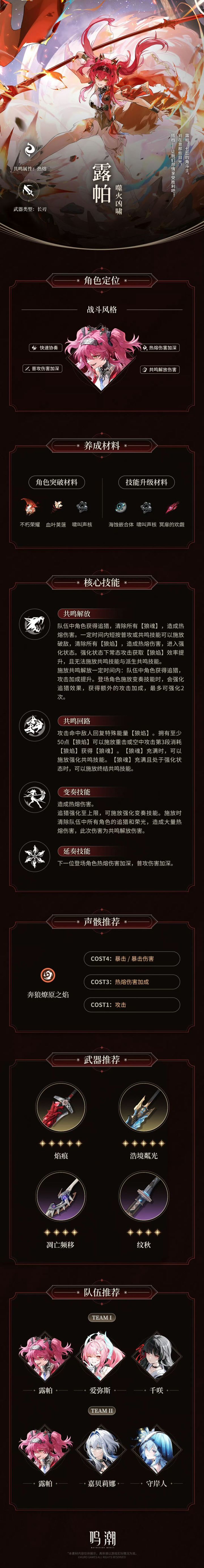 露帕是出身七丘地区的知名角斗士,也是竞技场中备受玩家关注的明星选手,角色性格热情率直,自带孤狼一般的野性气质,以享受纯粹竞技为核心信念,愿意为赛场与热爱全力以赴。该角色共鸣能力为噬火凶啸,定位偏向热熔属性队伍协同辅助,拥有优秀的协奏效率与队伍伤害增益效果,是火队体系中的关键适配角色。本次档案回顾完整梳理角色核心设定与背景脉络,同步衔接3.1版本整体内容规划,玩家可在版本更新后继续解锁相关剧情与玩法。