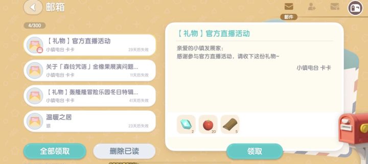 记得每天登录邮箱查收“小镇电台卡卡”的邮件,像“轰隆隆冒险乐园冬日特辑”“温暖之居”等主题礼包也会陆续发放,动动手就能领取资源包,包含金币、素材与限定道具!