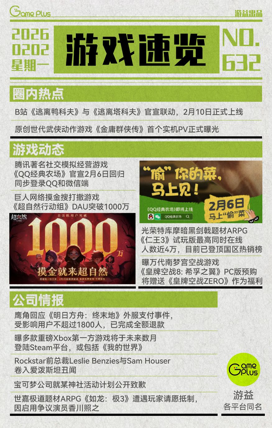 1.腾讯著名社交模拟经营游戏《QQ经典农场》官宣将于2月6日正式回归,同步登录QQ和微信端