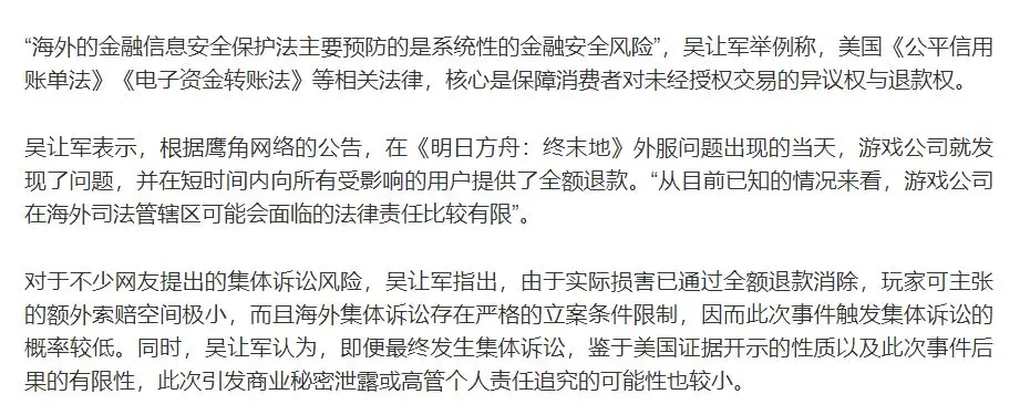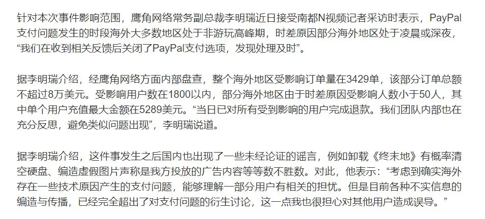 鹰角辟谣终末地外服支付事件订单总额仅8万