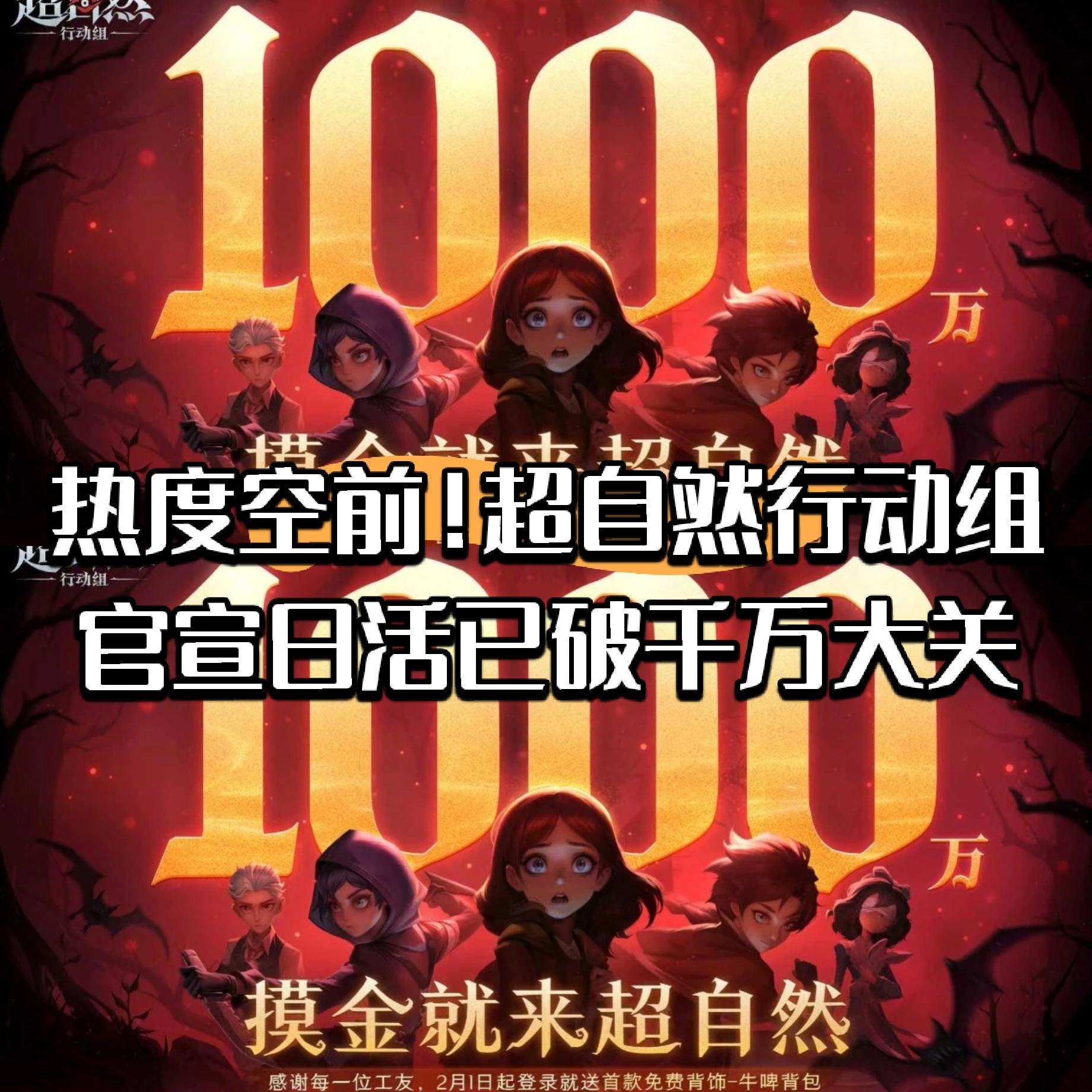 2月2日,巨人网络正式宣布其旗下手游《超自然行动组》的日活跃用户已突破1000万大关,这一成绩使得巨人网络成为当前A股市场中唯一拥有单款日活过千万产品的游戏公司,据悉《超自然行动组》自2025年1月正式公测,至今仅用约13个月便达成这一里程碑,项目组为感谢玩家陪伴,已从2月1日起向所有登录玩家赠送首款免费背饰牛啤背包作为答谢礼![[TapTap表情|TapFamilyxdoro2_粉狗比心]](https://img.tapimg.com/market/images/101c7e3200596fe8e03765080b467fb8.gif)