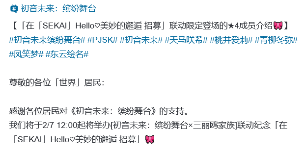 大的出现啦家人们!由SEGA Games、Craft Egg、Crypton Future Media三方合力企划,由SEGA Games、Colorful Palette共同制作,国服