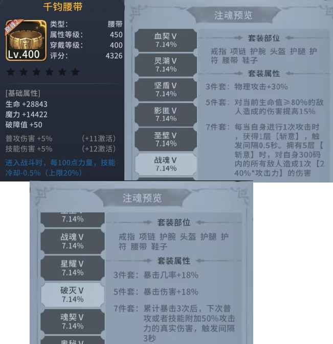 破灭三件套可以进一步提供大额暴击率,五件套则是提供稀缺的爆伤,在后期不缺CD的情况下也可以将腰带换成相应套件,提高输出上限。