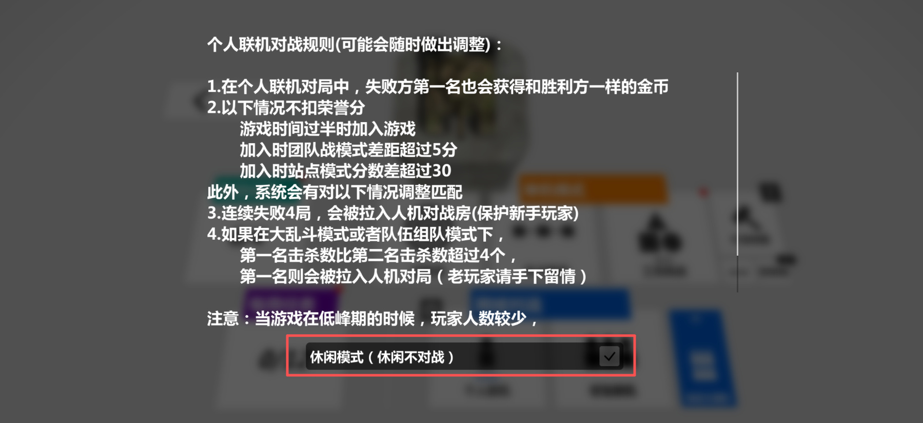 单人匹配界面已经可以自主选择是否进入和平房(休闲模式)