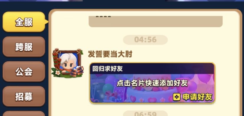 步骤如下:1:在聊天,全服,寻找回归玩家,如图4所示,添加,这些愿意交友的玩家,大多是为了1点体力,所以会更愿意用你的邀请码。