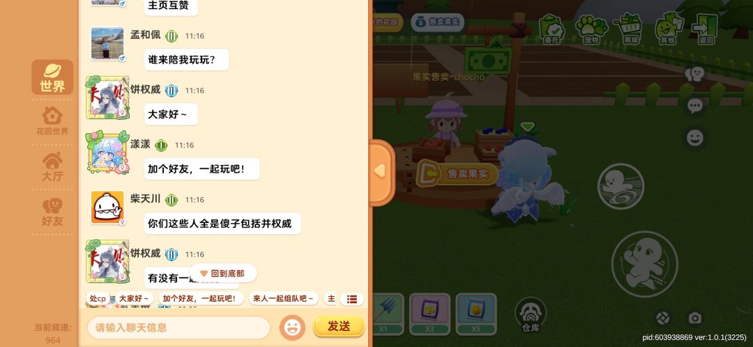 忙着种菜呢,突然瞄了一眼公屏有人吵架?好奇去看了一下,这个叫柴天川的人不知道什么原因突然莫名其妙辱骂扫射公屏其他玩家😅真的很影响观感,有些人开始怼他也被骂了。。真求求快上线拉黑和聊天权限功能吧,真的很怕哪天不小心惹到哪个熊孩子跑私信骂我