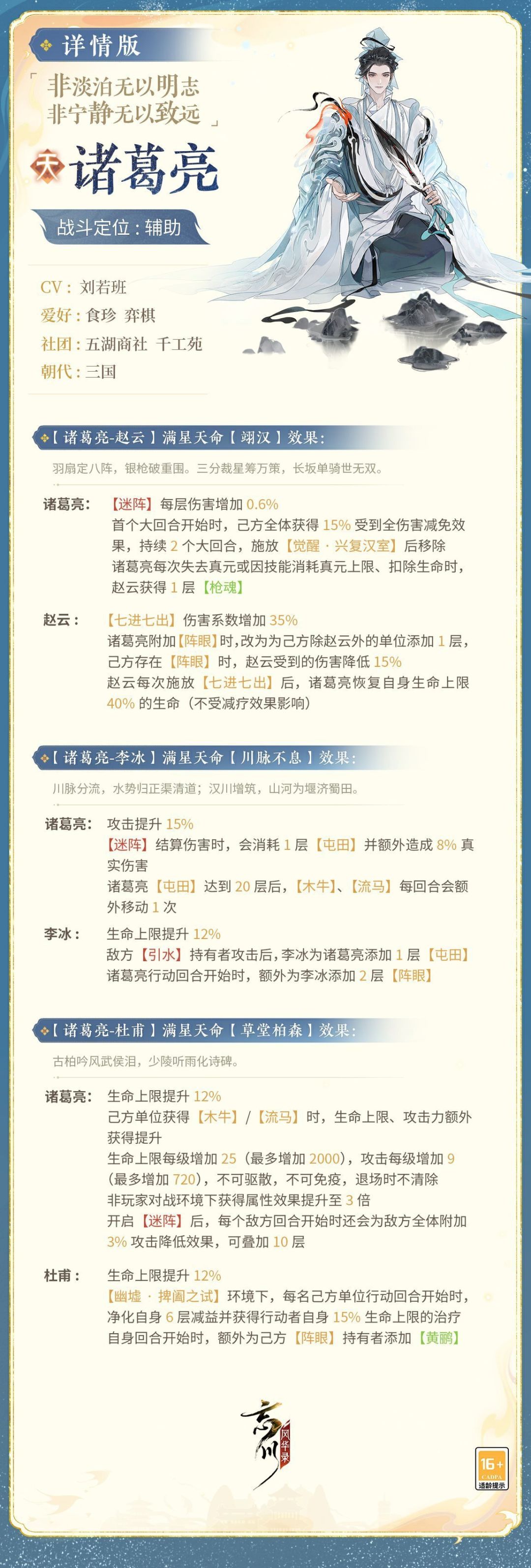 在忘川中,诸葛亮将作为辅助名士登场,使君大人可点击下图,共瞻孔明卧龙腾渊,匡扶汉室的志向!小麒麟抱来了详细的诸葛亮技能,使君大人快来看看吧!具体技能效果以上线实装为准哦~