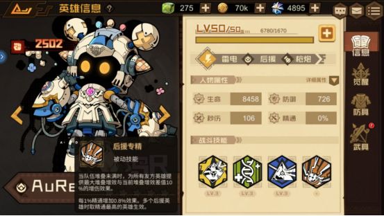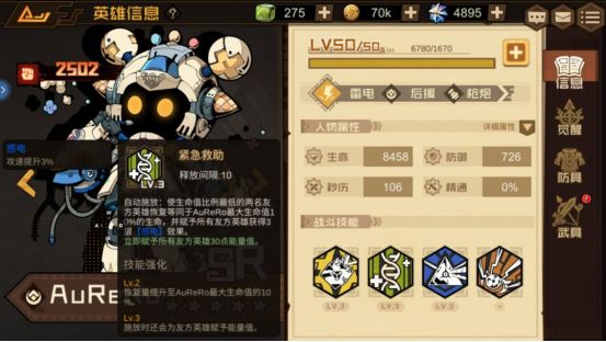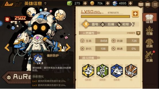 技能介绍:使生命值比例最低的两名友方英雄恢复等同于AuReRo最大生命值10%的生命,并赋予所有友方英雄获得3层【感电】效果