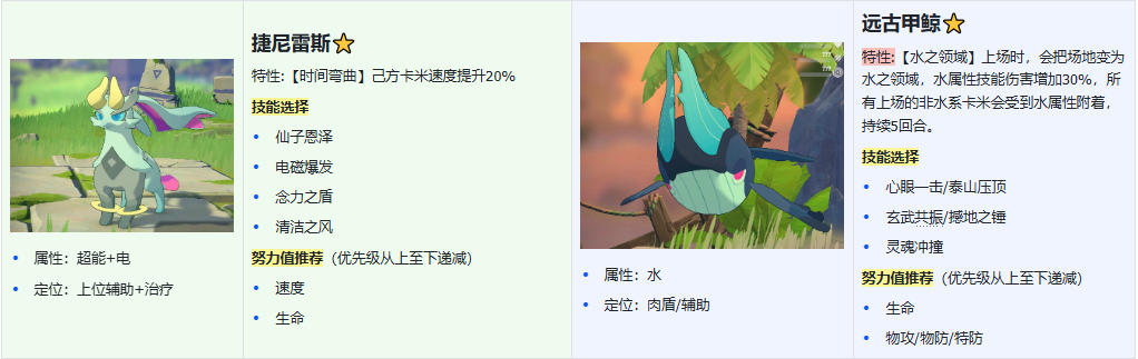 - 捷尼雷斯:3神兽之一,电偶的上位替代,专属技能“仙子恩泽”是目前含金量最高的变化技能,满星直接给队友回满血。捷尼雷斯在雨天队里主要是辅助生存位,它也是通过专属神兽活动捕捉,前面可以先用电偶过渡。
