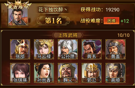 成功荣登本期益州之战榜首的是 花下独饮醉丶 军团,以 19290 的战功赢得第一的宝座!