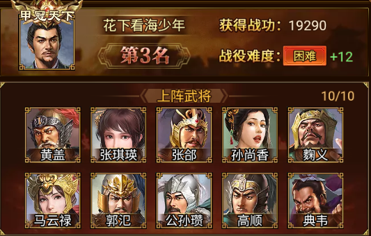 本期益州之战中赢得第三位的是 花下看海少年 军团,以 19290 的优异战功位居第三,恭喜!