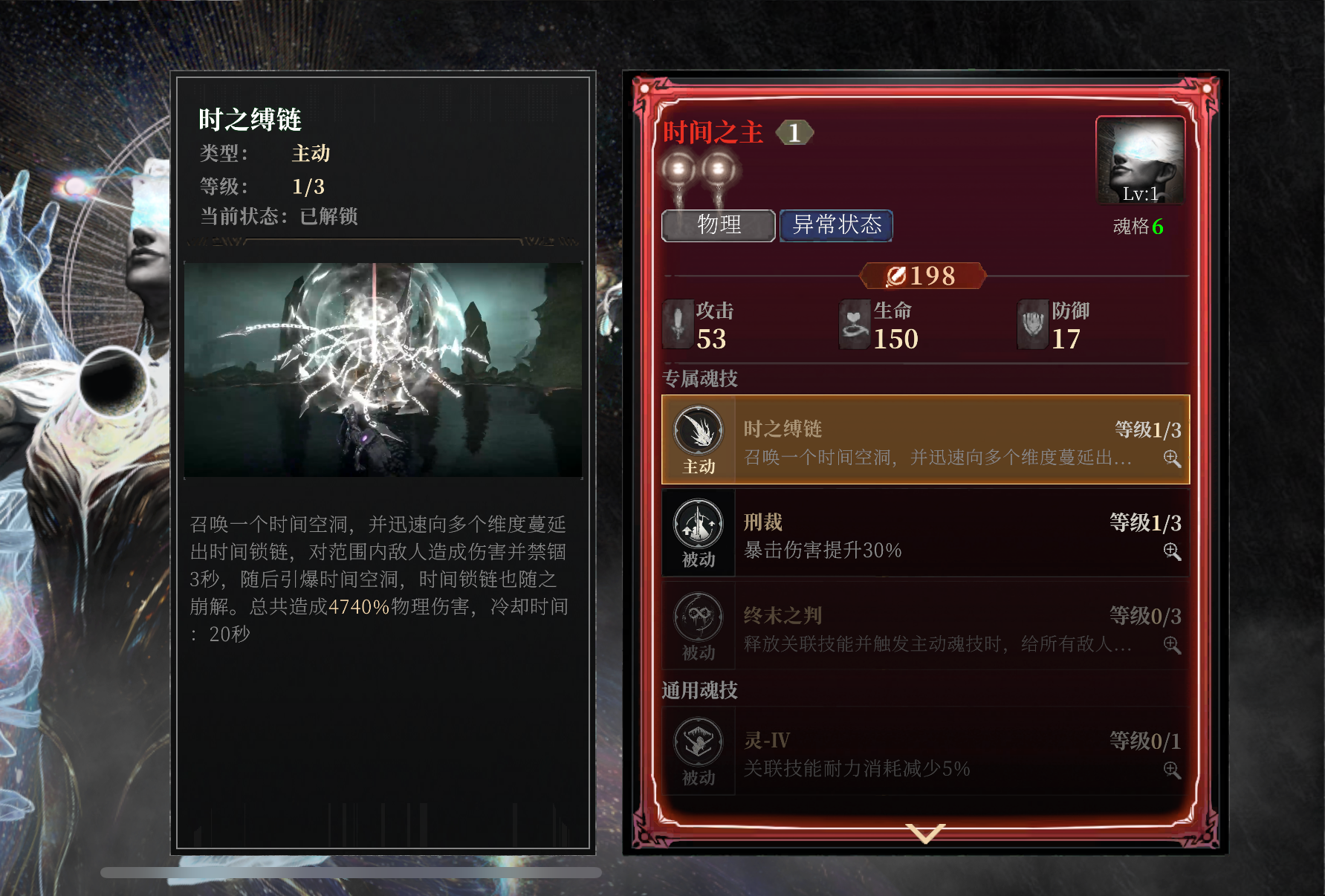 召唤一个时间空洞,并迅速向多个维度蔓延出时间锁链,对范围内敌人造成伤害并禁锢3秒,随后引爆时间空洞,时间锁链也随之崩解,造成大量物理伤害。冷却时间:20秒。