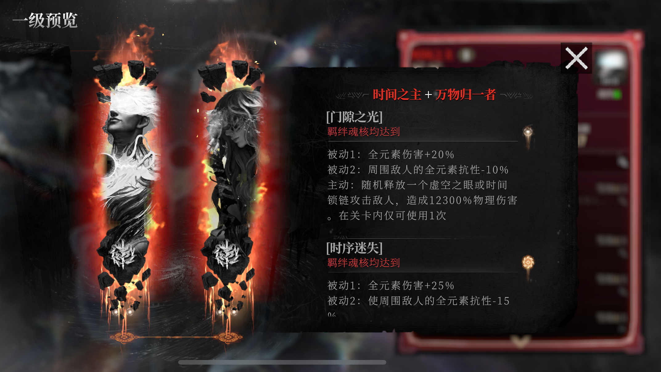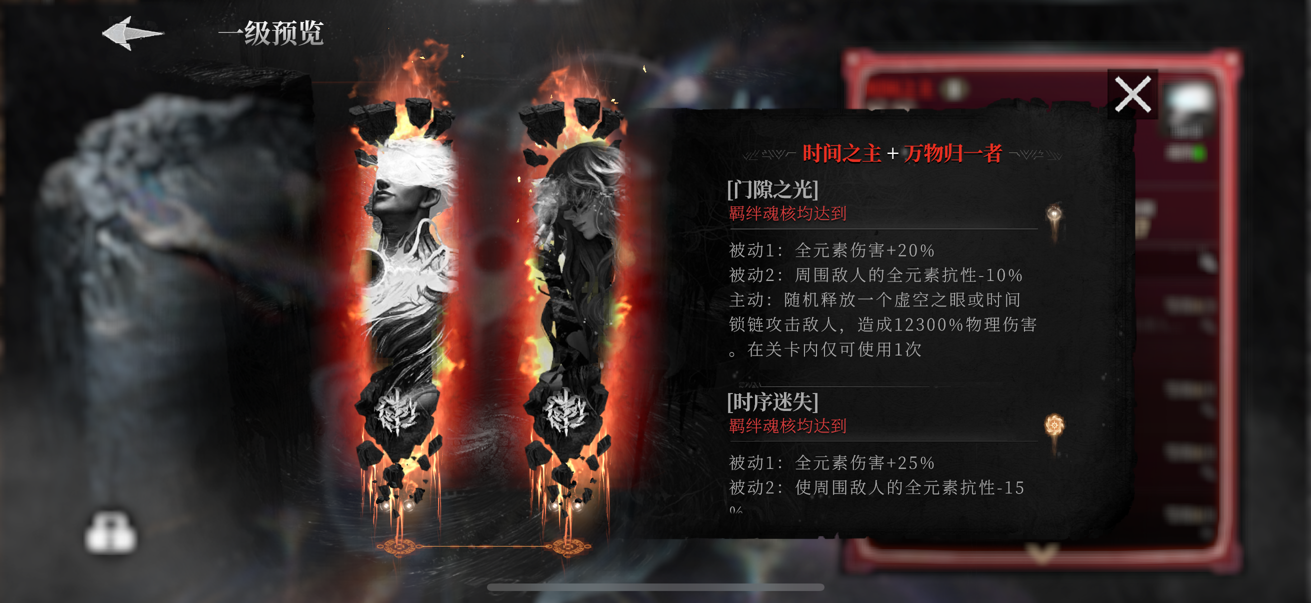 全元素伤害提升,周围敌人的全元素抗性降低;随机释放一个虚空之眼或时间锁链攻击敌人,造成物理伤害。在关卡内仅可使用1次