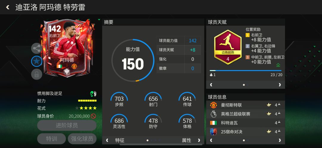 目前效力于英超曼联的阿玛德是名震足坛的边路爆点,也是科特迪瓦的边路进攻核心。游戏中,宿命对决活动推出的阿玛德基础能力值为142,配备了边路超跑天赋。