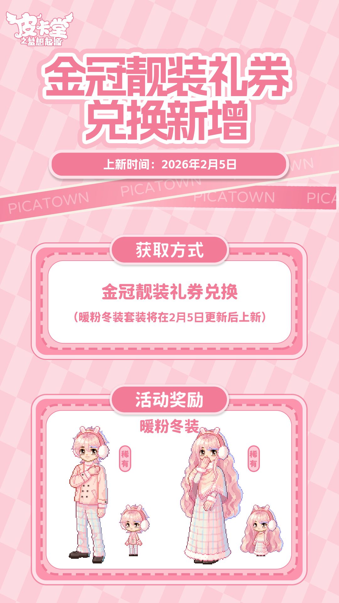 -【金冠兑换】稀有套装「暖粉冬装」将上架金冠商城,购买金冠可获得兑换道具靓装兑换券!