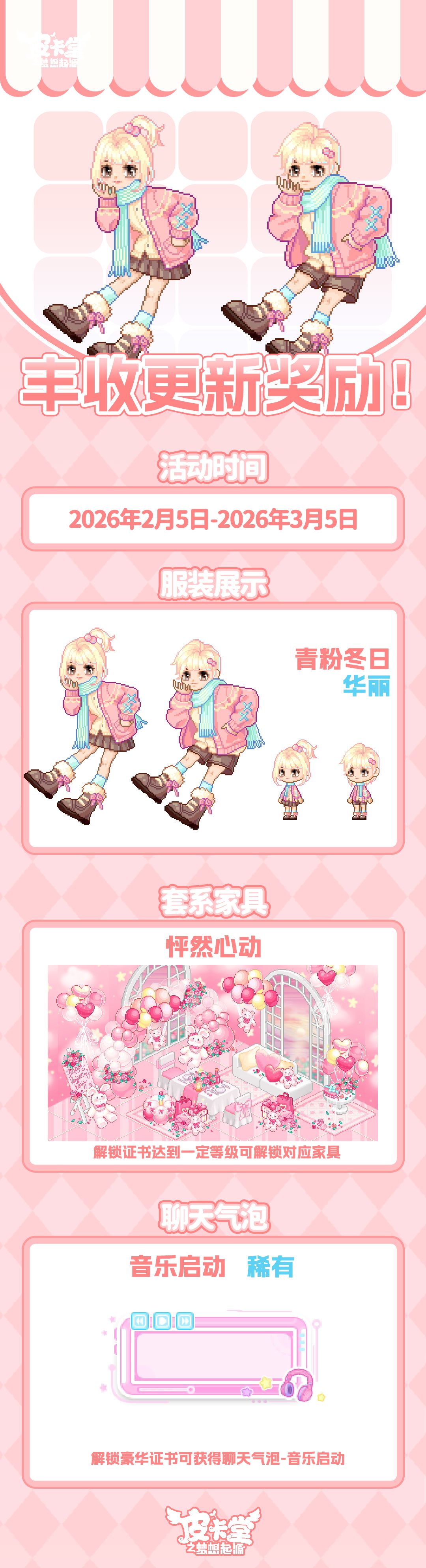 -【丰收通行证】更新上线!购买通行证并完成对应任务可获得套系家具「怦然心动」、华丽套装「青粉冬日」,加购高级通行证可获得本期丰收活动限定聊天气泡「音乐启动」!