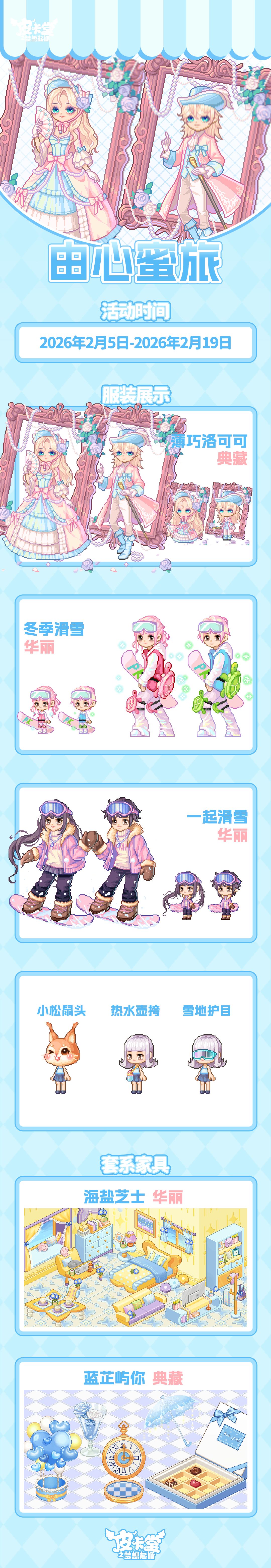 -【由心蜜旅】参与活动将有机会获得典藏套装「薄巧洛可可」、典藏套装「冬季滑雪」、典藏套装「一起滑雪」、套系家具「海盐芝士」、套系家具「蓝芷屿你」以及其他奖励哦!