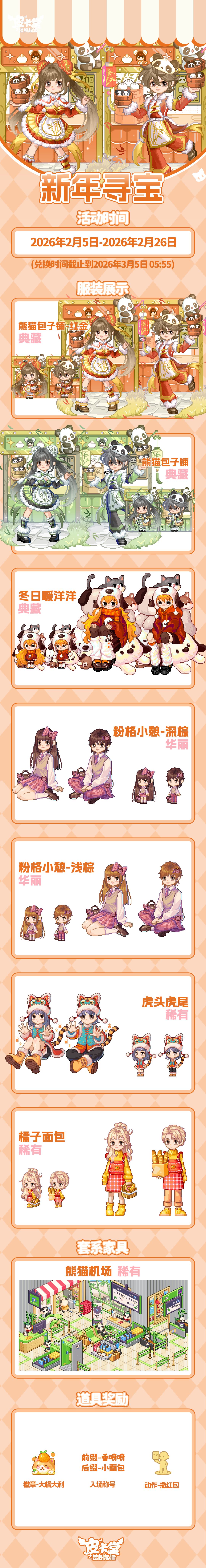 -【新春寻宝】活动限时上线!参与可获取活动徽章「大橘大利」、套系家具「熊猫机场」及装扮「熊猫包子铺」、「冬日暖洋洋」等多重寻宝专属奖励!