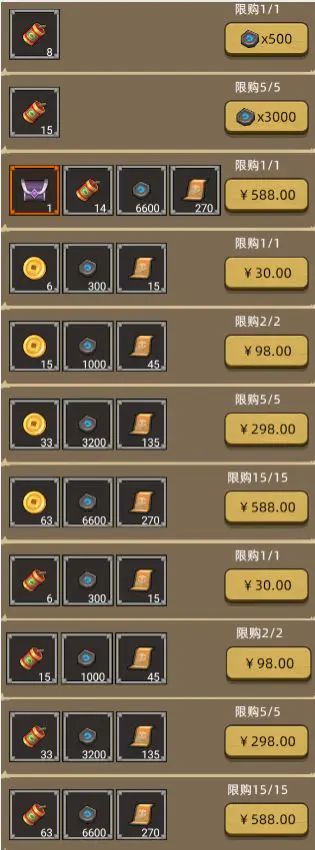 30元礼包 × 1、98元礼包 × 2、298元礼包 × 3、588元礼包 × 2