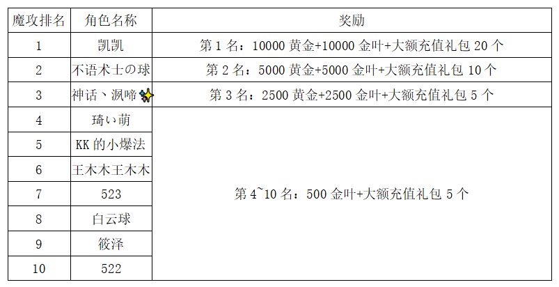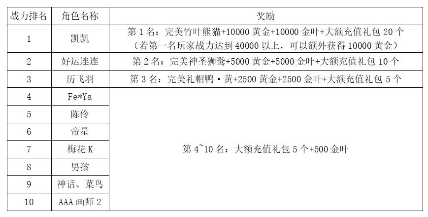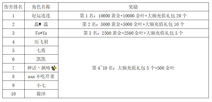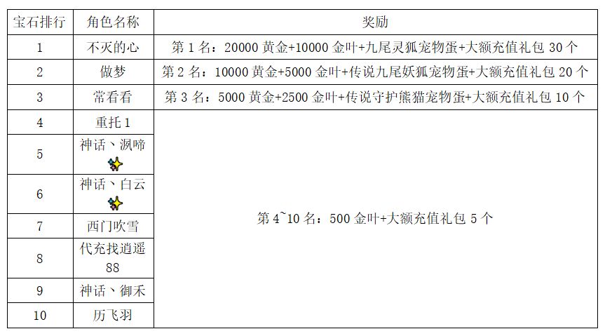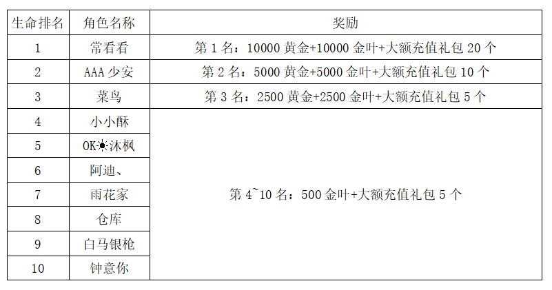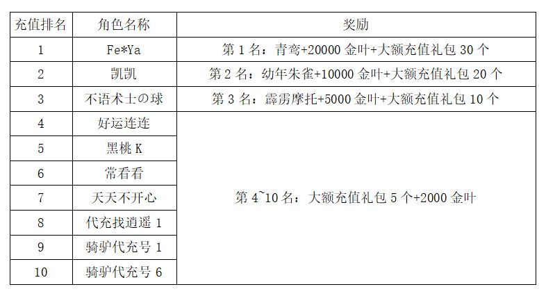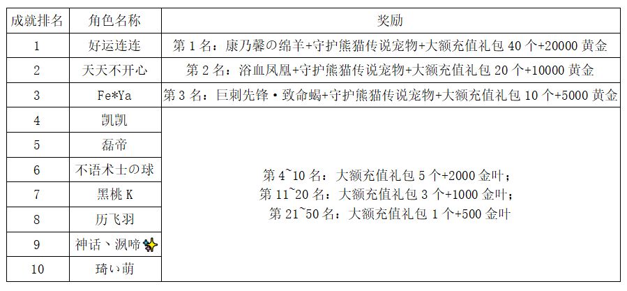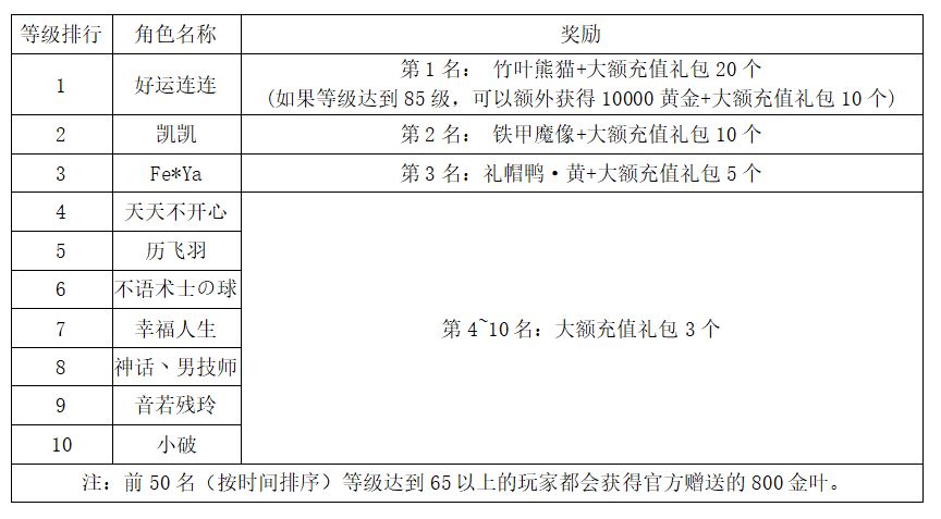 注:以上活动排名均以服务器时间为准。新区排行榜活动如发现存在违反游戏相关规定使用游戏外的辅助工具进行作弊将取消获奖资格。