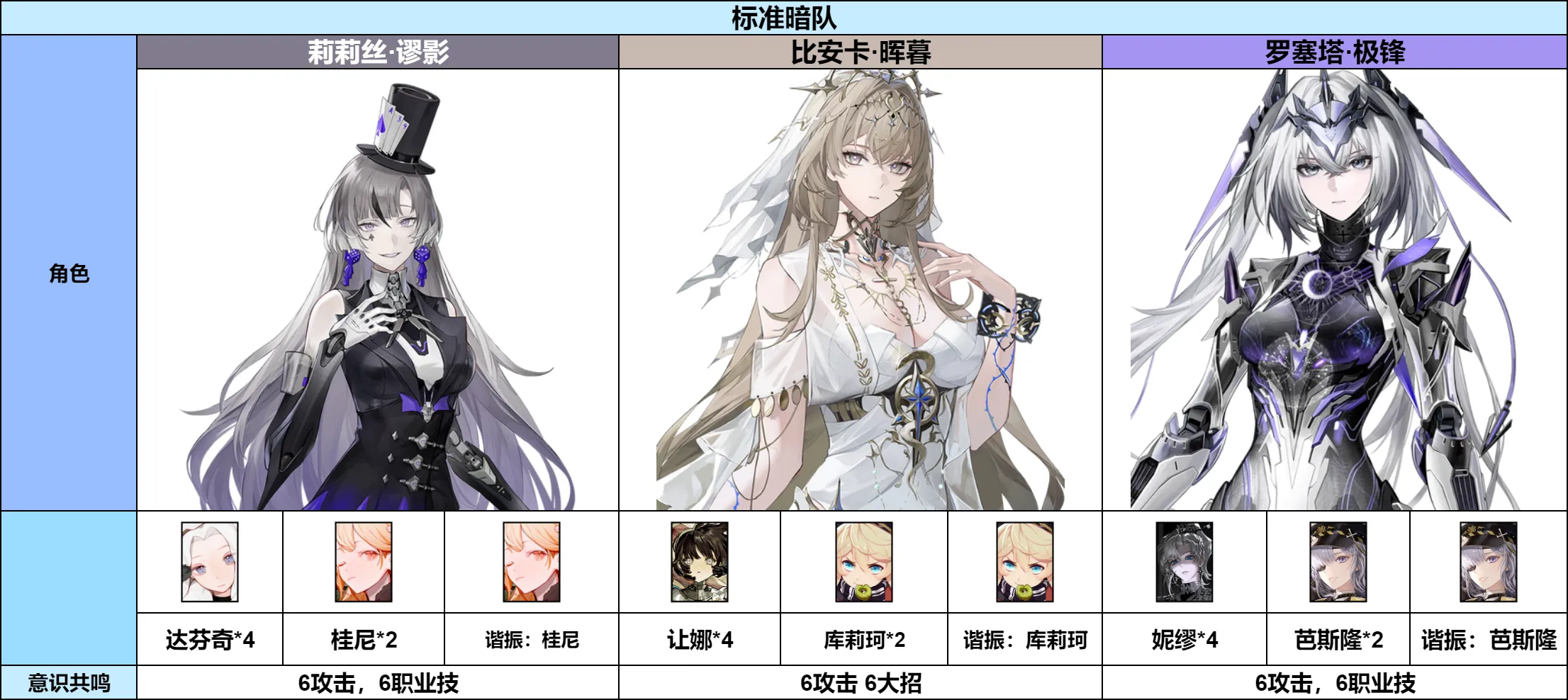 该推荐仅作为参考,并非各阶级养成下的最优解,实际搭配情况仍需以正式服的具体攻略为准。当极锋作为队伍主C时,意识共鸣也可以考虑6攻击6大招。部分情况下,如SS3晖暮与SS极锋轮切时,也可以考虑晖暮4让娜4巴斯隆,极锋4妮缪2库莉珂2爱因的意识搭配。更多的意识搭配分析可以等待正式服攻略~