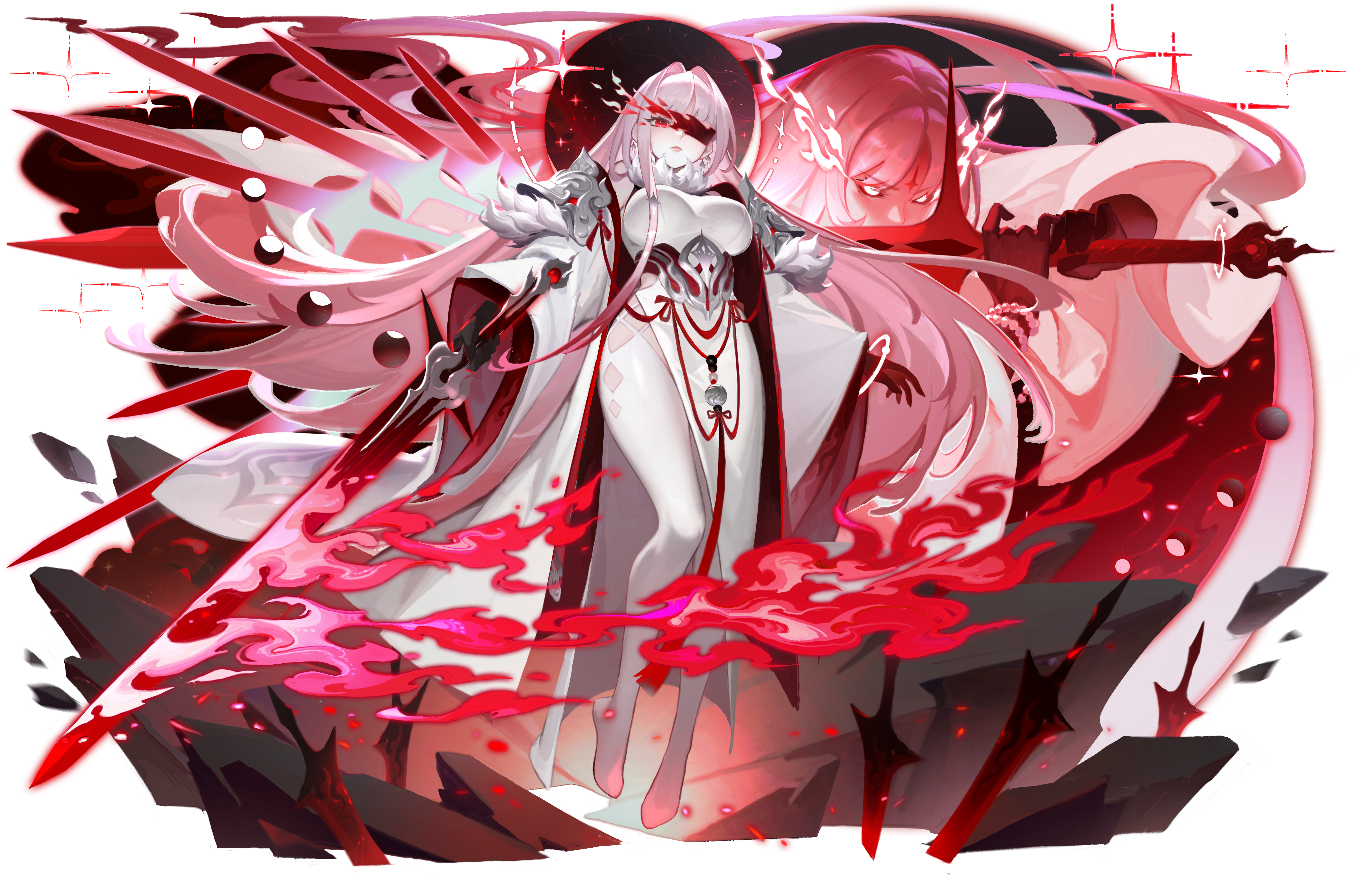 对敌方全体单位造成630%的伤害,并附带158%的混沌伤害,额外对其再造成一次79%的混沌伤害;自身获得1层<剑意> ;召唤<赤业剑> 对敌方攻击最高的4个单位造成320%的湮灭伤害;本次攻击附带4层日之贯穿效果及4层月之贯穿效果(<赤业剑> 升至对应等级后,会获得额外效果;2级:使目标绮焰点降低3点;3级:使目标天命值降低40点)。【需消耗4点绮焰值释放】