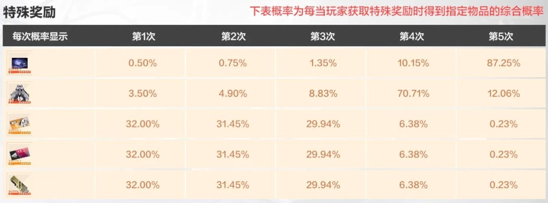 2500角色研发券、2500武器研发券、1个武器共鸣材料、比安卡·晖暮皮肤、主界面背景。每抽有1%概率获得特殊奖励,每20抽保底一个。