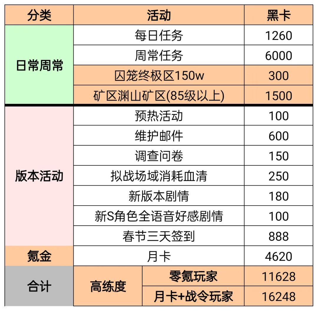 本次皮肤池持续整个版本6周,从2.3-3.17,可获取黑卡数量统计如下: