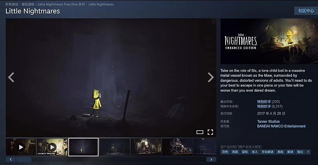 2017年4月28日,《小小梦魇》率先登陆PC、PS4和Xbox One平台,在steam上长期维持着特别好评的评价。