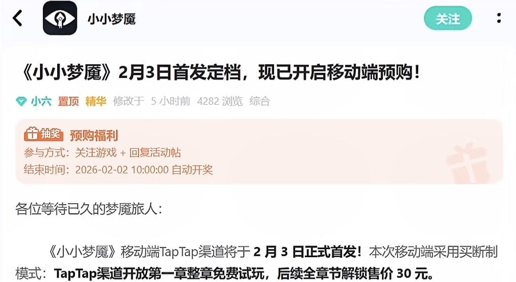 2026年2月3日,暗黑童话经典《小小梦魇》安卓端正式登陆TapTap平台首发,24元买断制解锁完整游戏,国区玩家可以免费领“饕餮灯笼”限定面具。