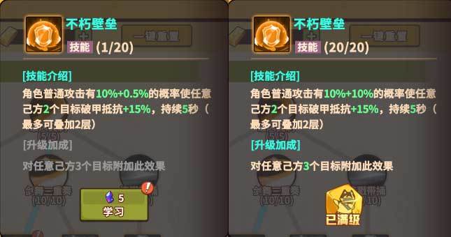1级时角色普通攻击有10%+0.5%概率使任意己方2个目标破甲抵抗+15%,持续5秒(最多可叠加2层),10级解锁对任意己方3个目标附加此效果的附加效果,随着升级每级触发的概率增加0.5%,满级技能有10%+10%概率使任意己方3个目标破甲抵抗+15%