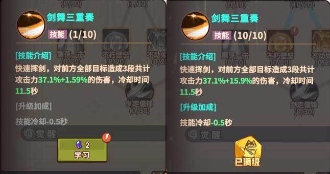 1级快速挥剑对前方全部目标造成3段共计攻击力37.1%+1.59%的伤害,5级解锁技能冷却-0.5秒的附加效果,随着升级每级造成的伤害多增加1.59%,满级技能造成攻击力37.1%+15.9%的伤害,全等级的冷却时间皆为11.5秒
