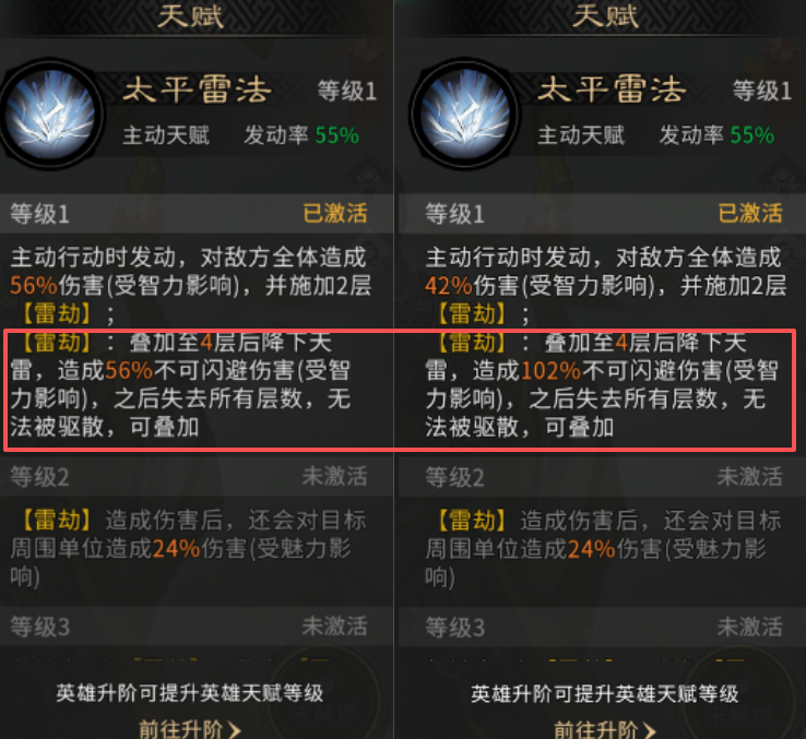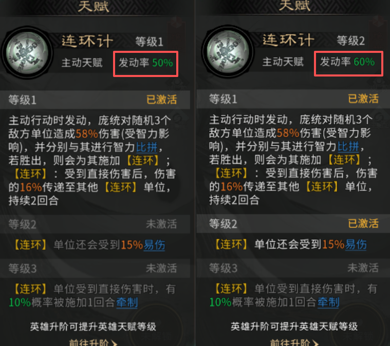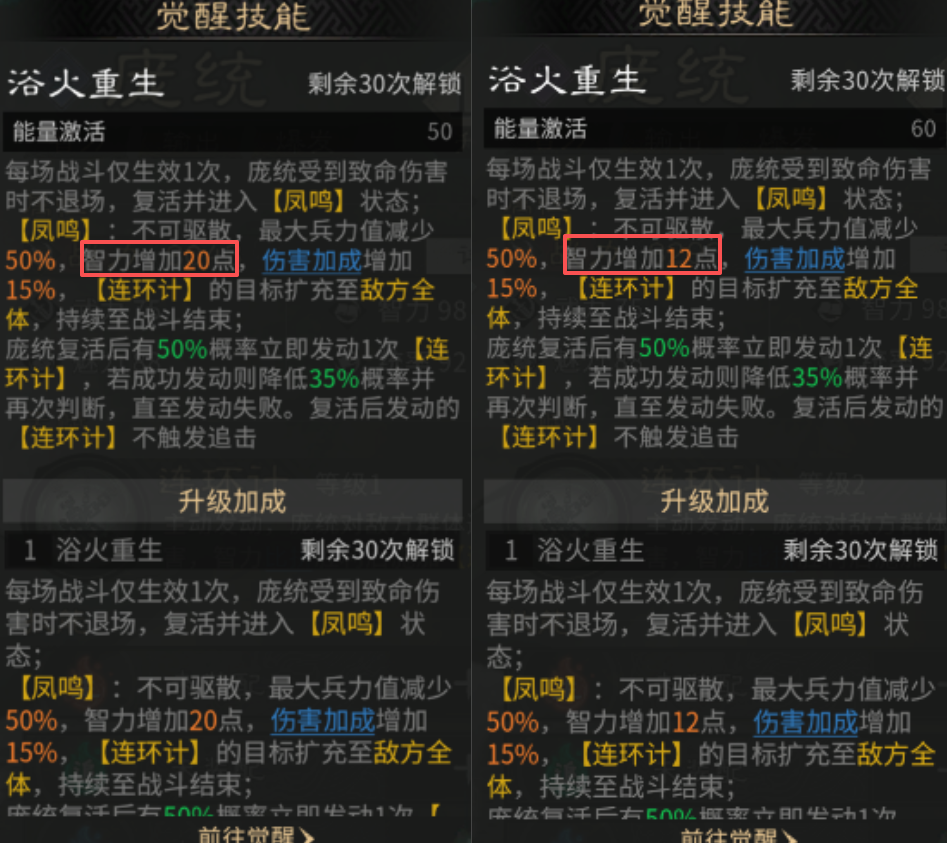 总结:本次测试中,庞统的调整整体偏向小幅加强。其核心提升在于1阶段天赋的触发概率从50%显著提高至60%,更频繁地发动意味着更稳定的控制和输出收益。虽然其觉醒技能的【凤鸣】状态智力加成从20点略微下调至12点,但相比关键概率的提升,此削弱影响有限。在策略游戏中,稳定的高触发率往往比波动的数值更具实战价值,因此庞统的此次改动无疑增强了他的实用性和阵容地位。