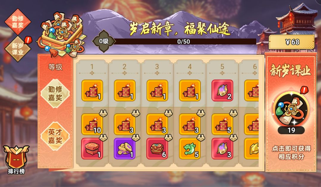 岁起新章,福聚仙途!仙友可在【勤修嘉奖】界面提交「清修功券」提升清修课业等级,解锁对应等级即可领取爆竹道具、神将置换石等资源;