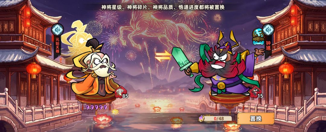 c. 置换时,两名神将的星级、持有神将碎片数量、悟道进度将互相置换;若两者存在品质差异,品质也将同步互换