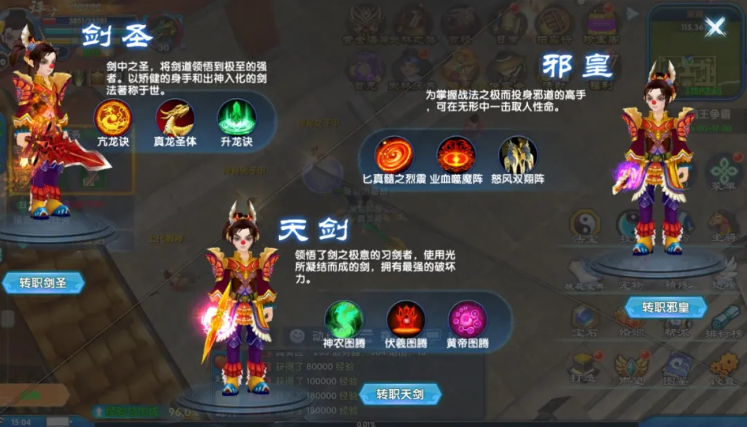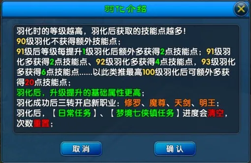 使用 “齐天大圣令”(羽化三转后可用),可进行本系职业兼修,同时使用新旧职业的技能。使用 “斗转星移令”(羽化三转后可用),可进行本系职业转职(如天师转魔尊),原技能点将返还。