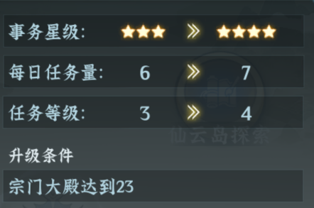 升级宗门大殿可以提升事务星级,星级越高则任务难度、消耗时间越高,奖励也会越丰厚。需注意宗门事务与太虚之眼事件规则不同,任务总量也需要通过升级宗门大殿提升,另外弟子派遣与护法派遣的星级也会单独计算。