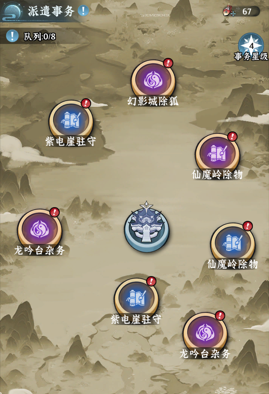 除神识探查发现的事件外,宗门中也有诸多派遣事务需要掌教师叔分别安排弟子与护法前去完成。虽不用亲自出马,但需要挑选出符合条件的弟子、护法才能提升事务完成几率。
