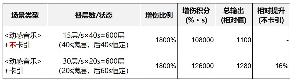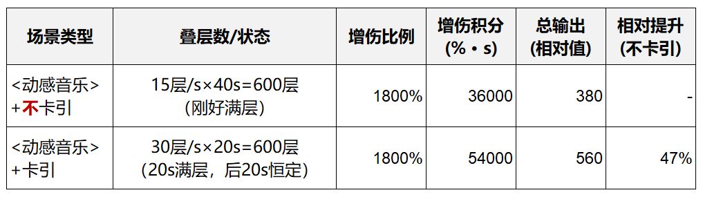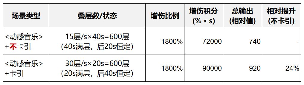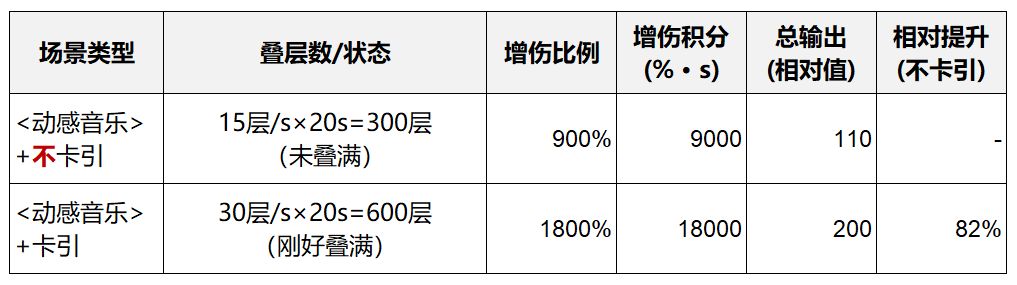 - 核心逻辑:携带<动感音乐>时,卡引的核心价值是“将满层时间从40s压缩至20s”,击杀时间越短,满层时间差带来的增伤收益越明显,且增伤满层后恒定,始终能带来正向收益。