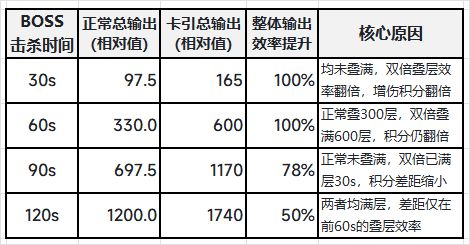 - 「速杀场景」(30-60s击杀):效率提升100%,卡引相当于输出翻倍,是收益最高的场景;