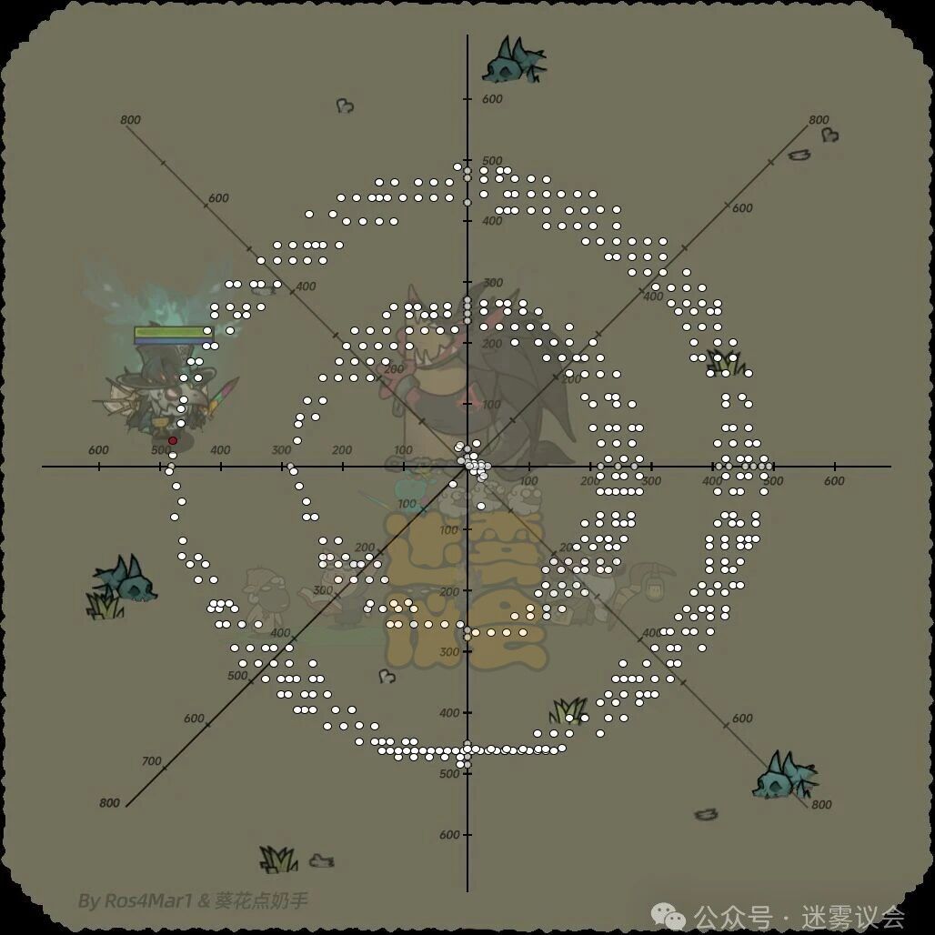 经测试,图中白色标记区域(后称卡引点)均可实现卡引。第一、四象限卡引点较多,与怪物贴身时也是Y轴右侧卡引点最多,所以正常情况下,角色位于怪物右侧卡引成功率最高。