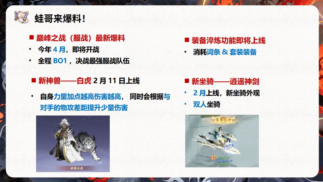 蛙哥:是的,蛙哥在前几日天命之战传奇组总决赛结束后给大家进行了新版本爆料。新神兽是白虎,一只物理单攻神兽,新坐骑是逍遥神剑,天赐品质的双人坐骑,还有装备套装的淬炼功能,以及未来服战的内容。
